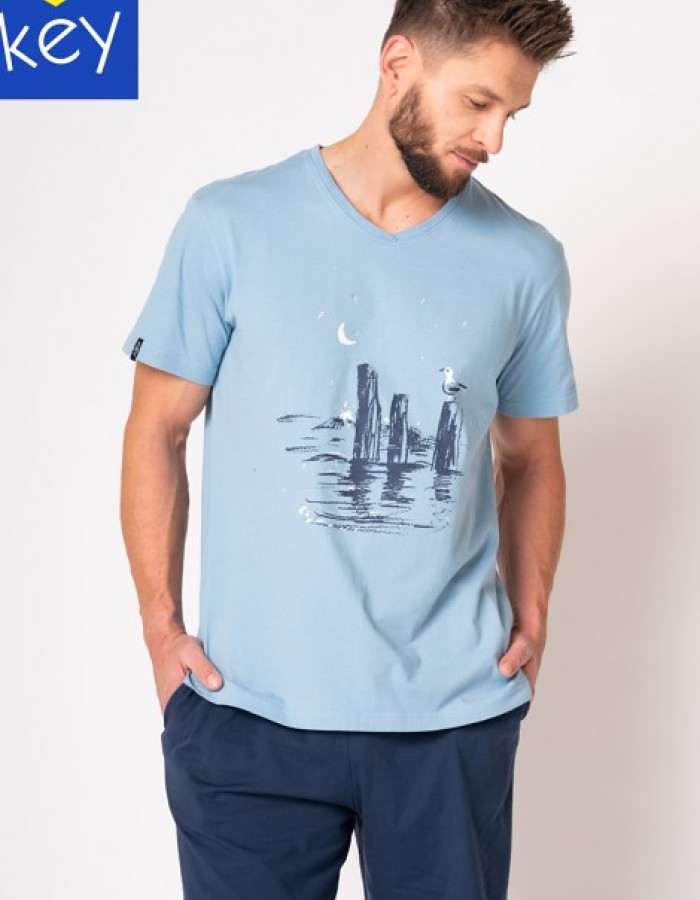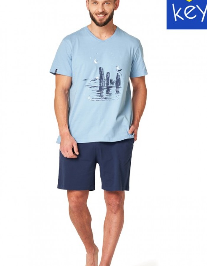 Чоловіча піжама від польського бренду Key. Піжама виконана з якісної та м'якої бавовни, складається з футболки блакитного кольору та темно-синіх шортів. Футболка вільного крою, з короткими рукавами та V-подібним вирізом горла, спереду прикрашена принтом нічного морського пейзажу. Шорти вільні з м'якою гумкою в поясі та зручними бічними кишенями, регулюються по ширині за допомогою внутрішнього шнурка.