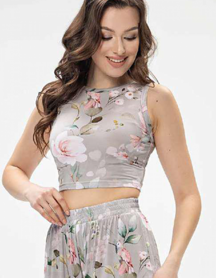 Стильна піжама жіноча від українського бренду Shato виконана з якісної та м'якої віскози, сірого кольору в рожевий квітковий принт, складається з топу та штанів. Топ прилеглого силуету, без рукавів та з невеликим круглим вирізом. Штани вільного крою, з м'якою гумкою в поясі та зручними бічними кишенями. Піжама дуже стильна та комфортна.