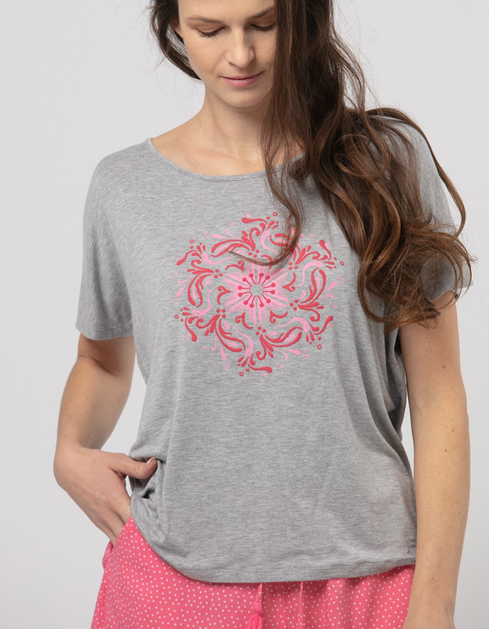 Футболка вільного крою з коротким рукавом та округлим вирізом горловини, спереду прикрашена аплікацією,короткі принтовані шорти, з бічними кишенями, зручною гумкою та куліскою в поясі.